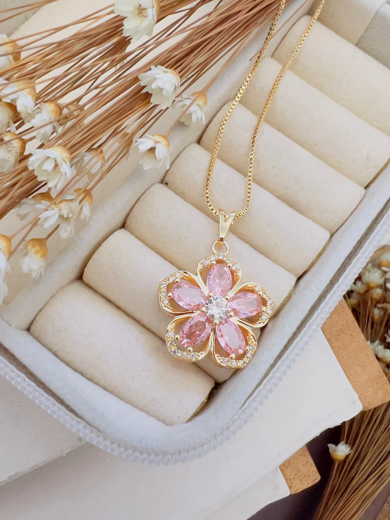 Colar Folheada a Ouro Micro Zircônia Flor Rosa – 409
